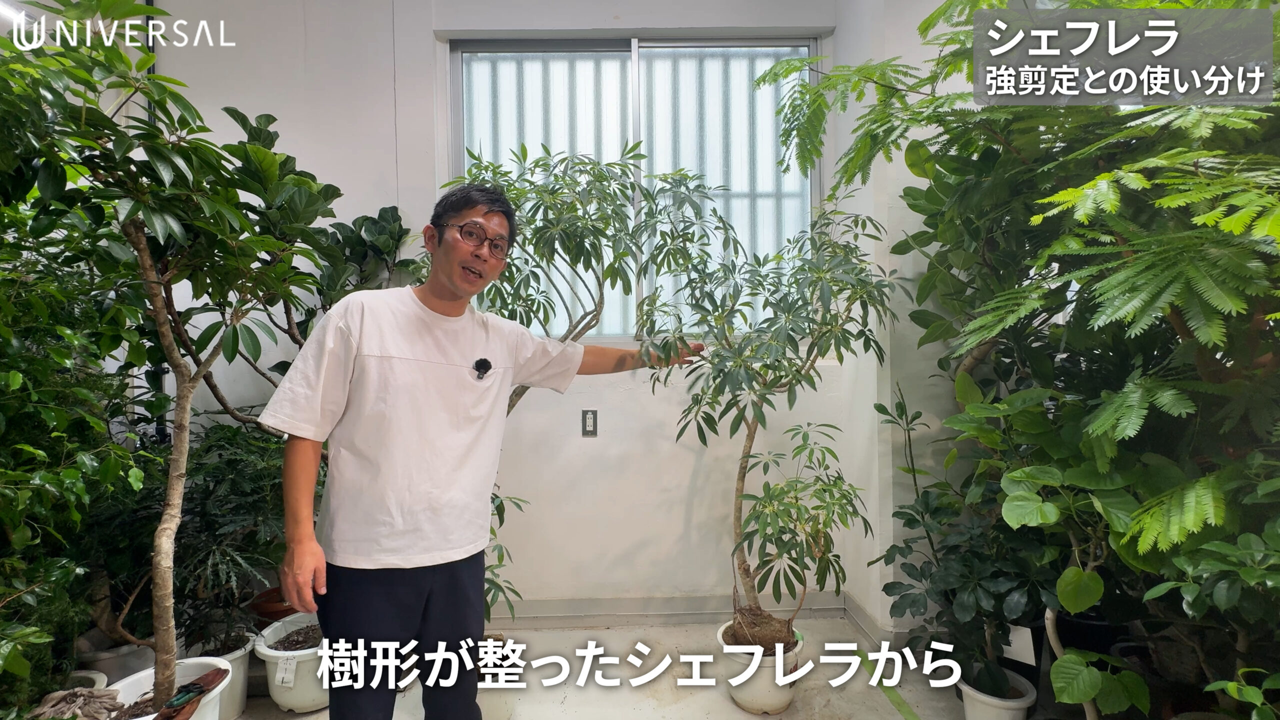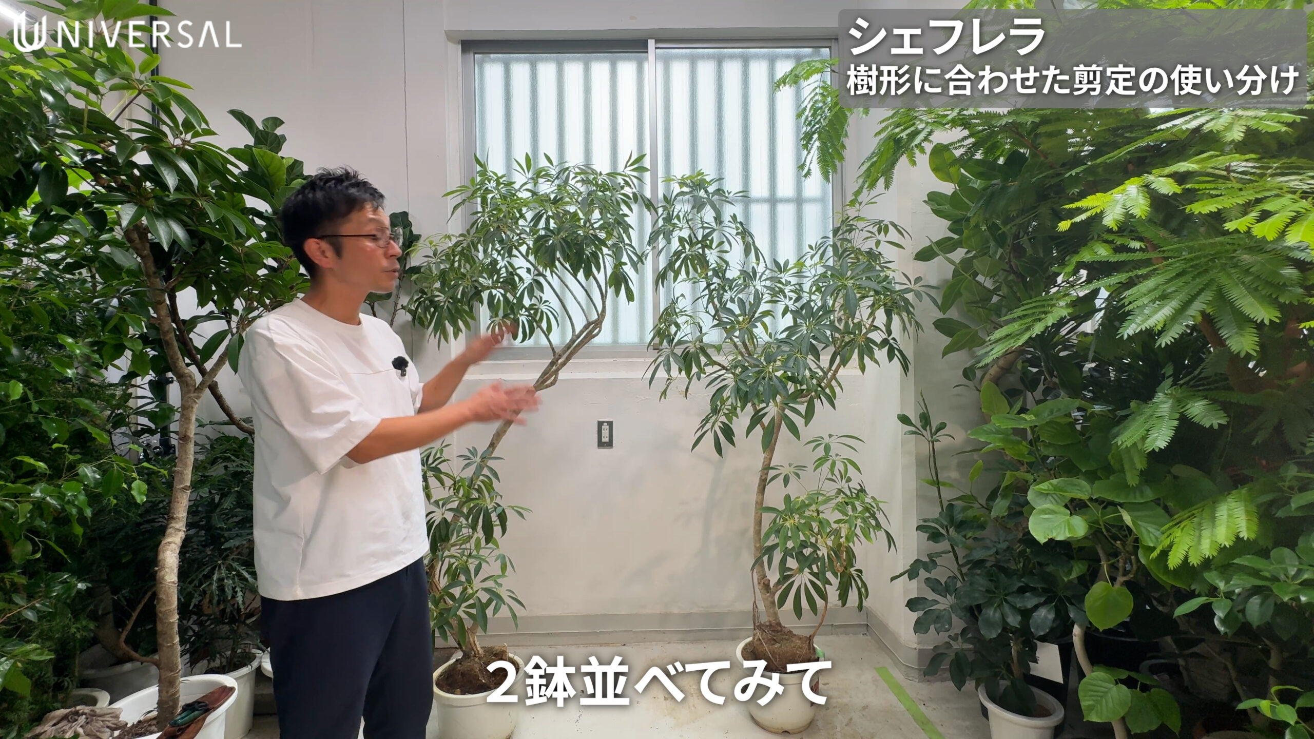 シェフレラは樹形によって剪定方法を変えることが大切です。枝がまっすぐ伸びて木のように見える株は、丸坊主剪定で形を整えます。一方、曲がりながら伸びる株は、その流れを活かして自然な雰囲気を残す剪定がおすすめ。レンタルグリーンなどで疲れた株は思い切ってリセットしますが、自宅観賞用なら枝がスカスカになった時点で整えると、健康で美しい姿を取り戻します。